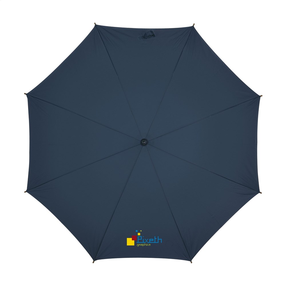 Paraply med 190T polyesterskærm, metalstel, skaft og håndtag i træ og velcrolukning.