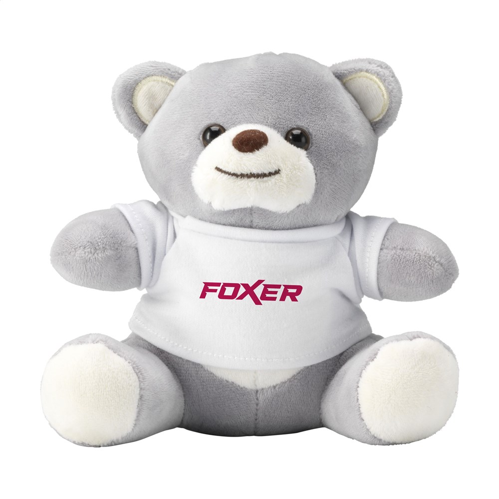 Lysegrå og blød plysbjørn i ministørrelse. Med glasøjne, hård næse og hvid T-shirt. Uden trykning leveres bamser og T-shirts løst.