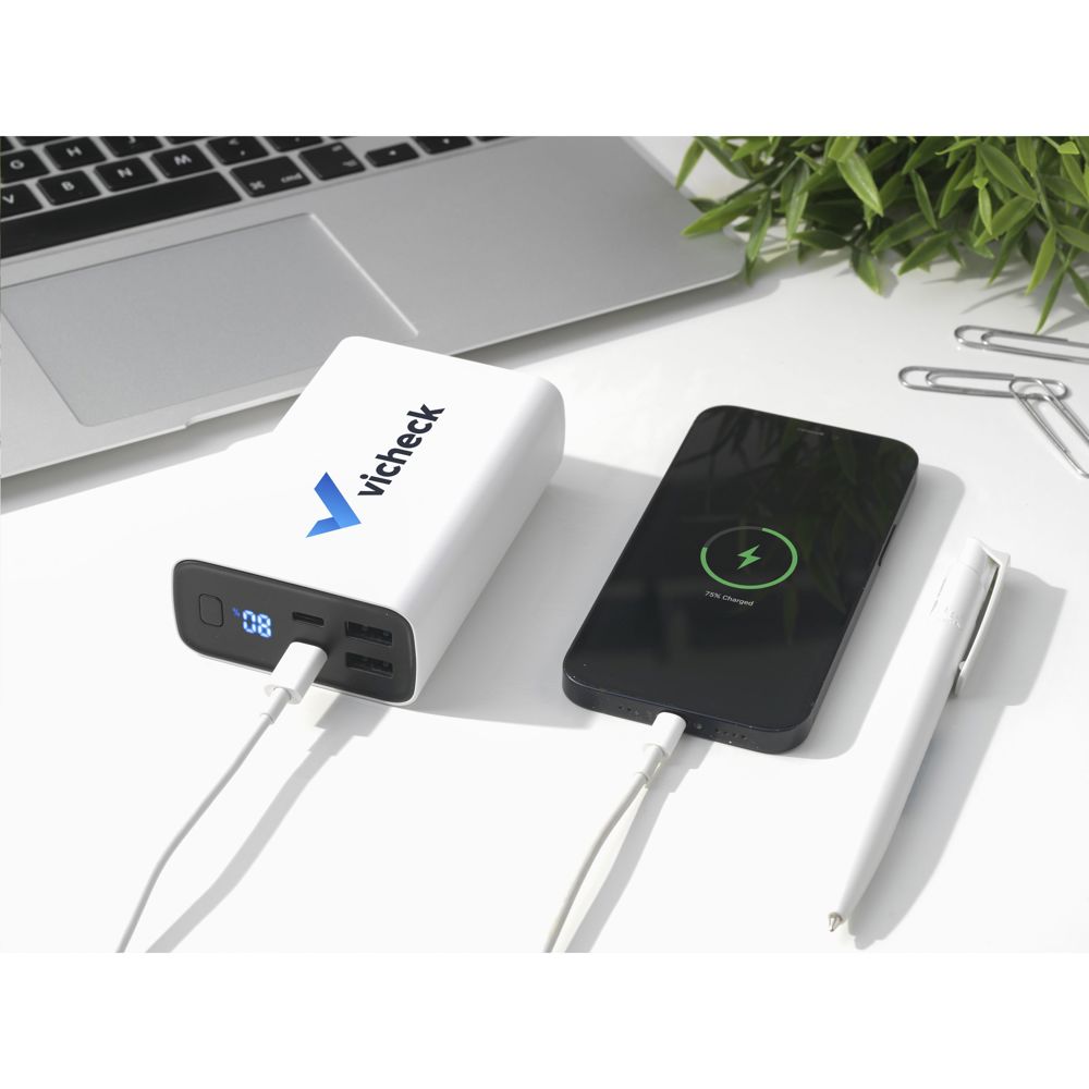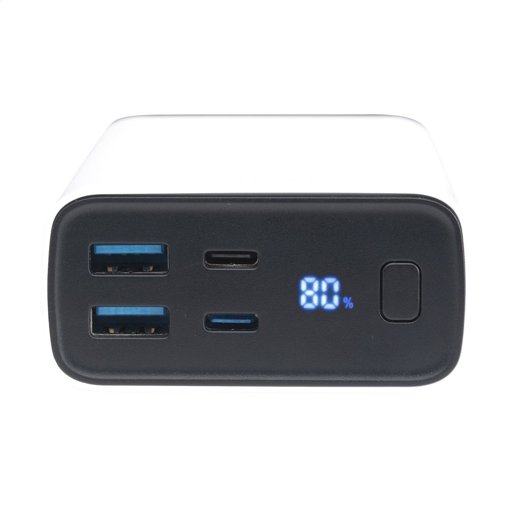 Meget kraftig powerbank med indbygget 20000 mAh Litium-polymer batteri. Kabinettet er lavet af 100% RCS-certificeret genanvendt ABS. Med tænd/sluk-knap og et display med procentvis batteriindikation. Type-C-indgang: DC5V/3A, 9V/2A, 12/1,5A. Type-C-udgang: DC5V/3A, 9V/2,22A, 12/1,67A. USB-A-udgang: DC5V/3A, 9V/2A, 12/1.5A. Kablet udgang: 22W. Inkluderer rTPE-ladekabel USB-C til USB-C og brugsanvisning. Pakket per stykke.