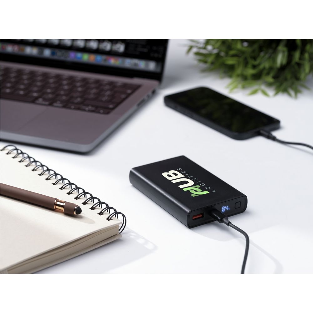 Kraftig powerbank med indbygget 10000 mAh Litium-polymer batteri. Kabinettet er lavet af 100% RCS-certificeret genanvendt ABS. Med tænd/sluk-knap og et display med procentvis batteriindikation. Type-C-indgang: DC5V/3A, 9V/2A, 12/1,5A. Type-C-udgang: DC5V/3A, 9V/2,22A, 12/1,67A. USB-A-udgang: DC5V/3A, 9V/2A, 12/1.5A. Kablet udgang: 22W. Inkluderer rTPE-ladekabel USB-C til USB-C og brugsanvisning. Pakket per stykke.