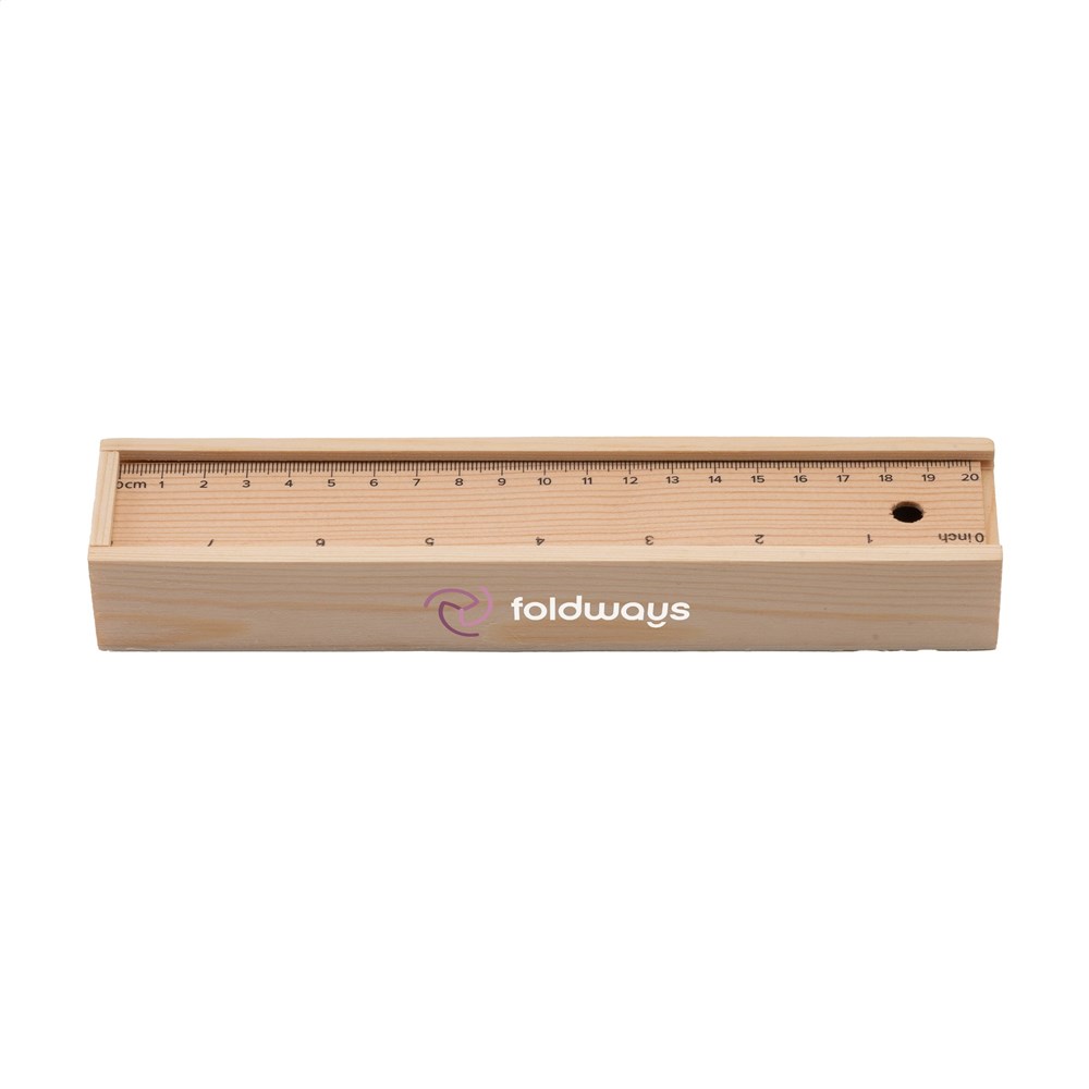 Opbevaringsæske i træ med glidelåg (20 cm lineal), 12 spidsede farveblyanter og en blyantsspidser i træ.