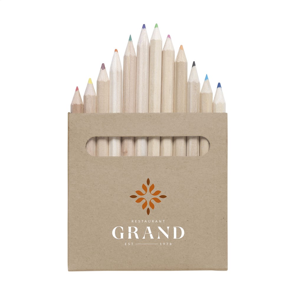 12 farveblyanter i ufarvet træ i en kartonæske af genbrugsmateriale.