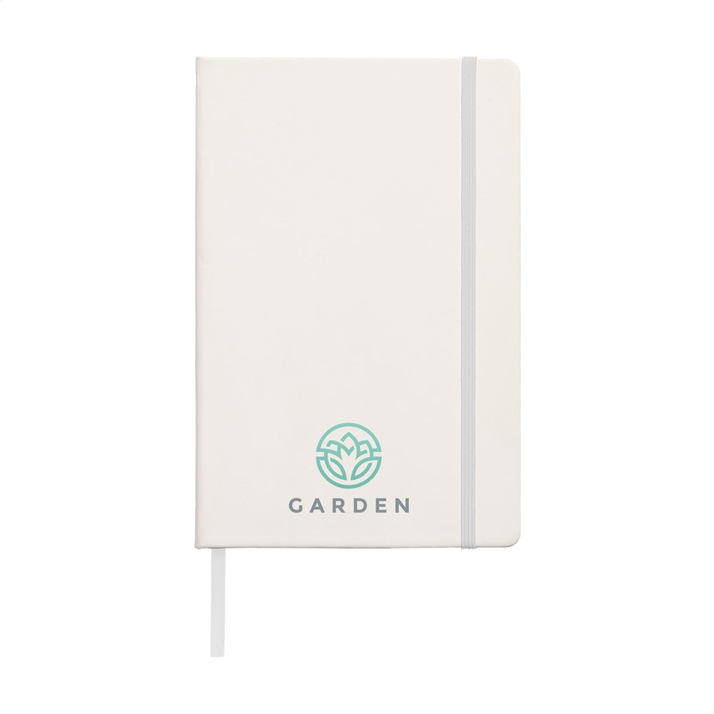 Notesbog i A5-format med ca. 96 ark/192 sider cremefarvet, linjeret FSC Mix certificeret papir (80 g/m²). Med indbundet ryg, hardcover, elastiklukning og silkebånd.