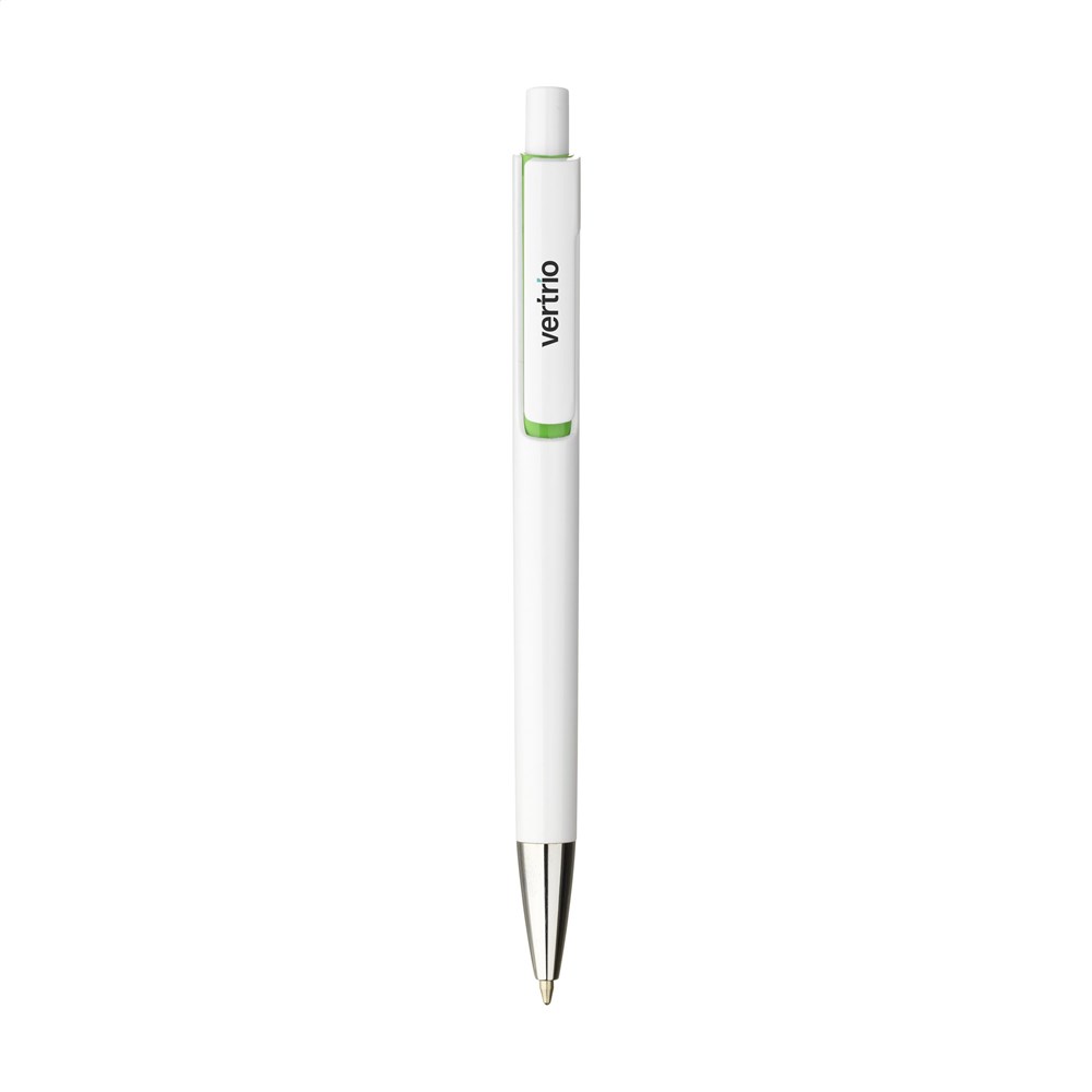 Kuglepen med blåt blæk og skaft af 100% genanvendt ABS. Med unikt design: Skaftet og clipsen er designet i et stykke, hvilket gør den specielt iøjnefaldende. Med farvedetaljer under den optisk 'svævende' clips. GRS-certificeret.